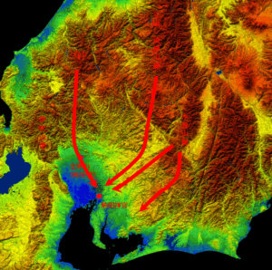 立山・飛騨山脈(北アルプス)からの龍脈、両白山地(白山)からの龍脈、
