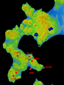 氣を散じないようにする「砂」も東に恵山、西に大千軒岳と七ツ岳があり