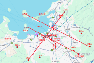 巽坐乾向(そんざけんこう)といい、朝鮮半島や中国大陸へ向いた都市なのです。