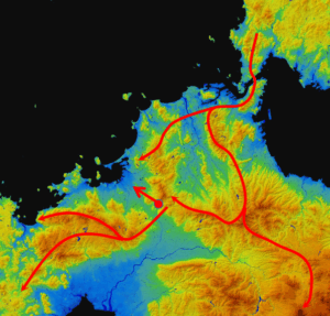 本州・山口県の長門丘陵からの龍脈が北九州・門司から三郡山地を通り、